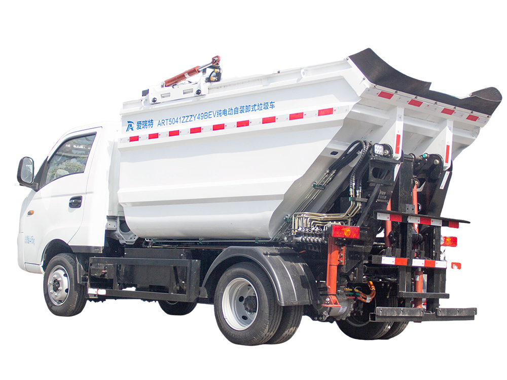 ART5041ZZZY49BEV純電動自裝卸式垃圾車采用后置翻桶機(jī)構(gòu)上料,高位傾翻垃圾箱卸料的生活垃圾收運(yùn)車,能夠同時滿足兩個標(biāo)準(zhǔn)垃圾桶同時上料,?作業(yè)效率極高,?適合城市小區(qū)、主次干道和沿街標(biāo)準(zhǔn)垃圾桶的收運(yùn),同時可以與大型純電動壓縮式垃圾車進(jìn)行車車對接。
