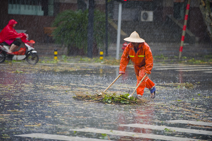 暴雨中,城區(qū)大街小巷雨水橫流,部分主次干道積水嚴(yán)重。環(huán)衛(wèi)工人冒著大雨,不顧汽車濺起的臟水,積極清理和疏通路面積水,確保大街小巷排水暢通。許多低洼路段的環(huán)衛(wèi)工更充當(dāng)起排水工。